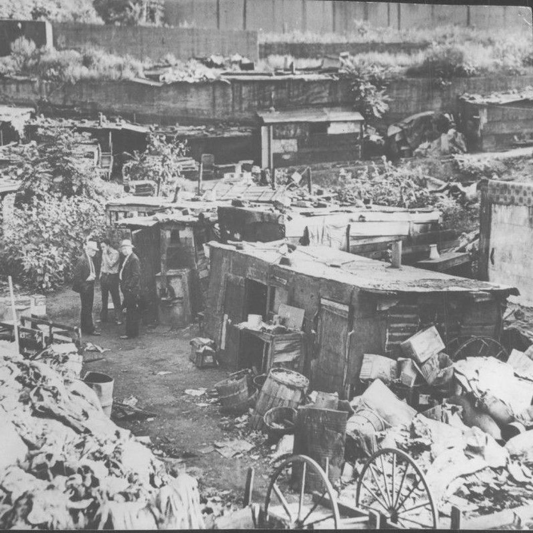 A “Hooverville” was a shanty town built during the Great Depression. They were named after President Herbert Hoover who was in office during the onset of the Depression and was widely blamed for it. People would build shelter from crates, cardboard, scraps of metal and whatever they could find. They would use newspapers as blankets and line their worn out shoes with cardboard. Residents often relied on public charities and begging for food.