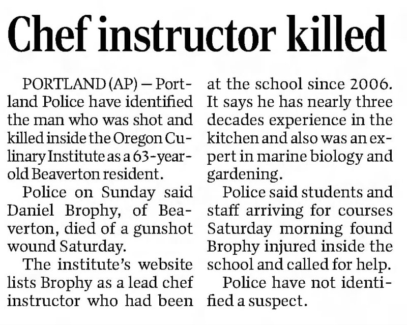 On June 2, 2018, first responders were called to a shooting at the Oregon Culinary Institute, where they found Daniel Brophy, 63, mortally wounded, having been shot twice – once in the back and once in the chest. According to the medical examiner, both shots pierced the heart. Life-saving measures were taken, but he died on the scene.