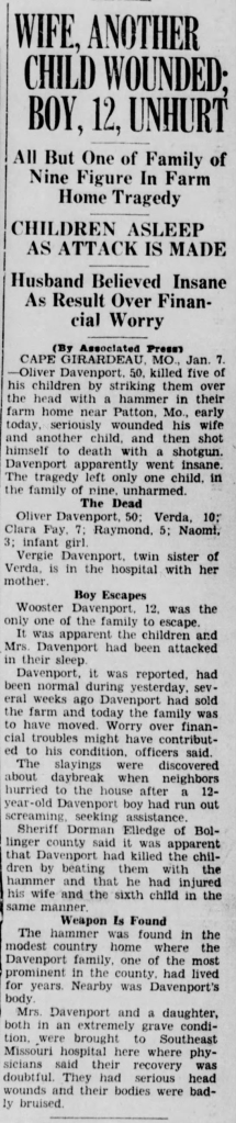 The events of this case took place near Patton, MO. Patton is located in Bollinger County, which sits along the Missouri-Illinois border and is roughly 100 miles south of St. Louis. This area is full of rural farming communities, and it was on one of these farms the Davenport family lived in January of 1932. Oliver Davenport was known as a family man and had a good reputation. He and his wife, Clara, lived on the small farm off Highway 51 with their seven children: Wooster (12), twins Vergie and Verda (10), Clara Fay (7), Raymond (5), Louise (3), and Vanita (10mo).